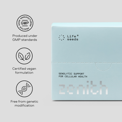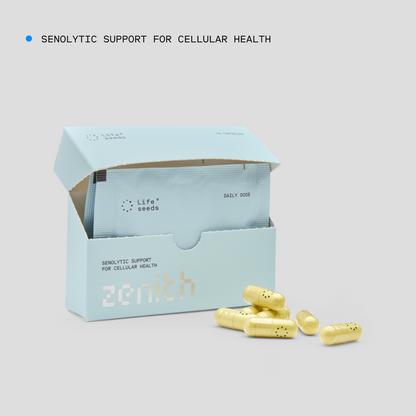 Zenith is designed for adults who take a proactive approach to aging. Cellular senescence accelerates with age, particularly after 60 — but the accumulation begins long before that. If you're already thinking about longevity, Zenith fits into that mindset. It is not intended for children, pregnant or nursing women, or individuals on blood-thinning medication without consulting a physician.