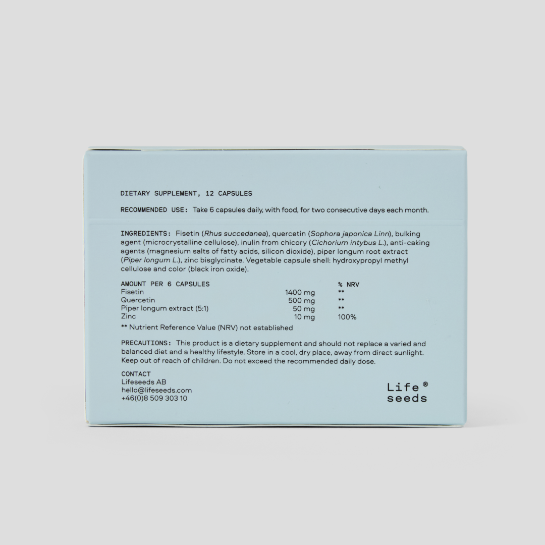 Ingredients: Fisetin (Rhus succedanea), quercetin (Sophora japonica Linn), bulking agent (microcrystalline cellulose), inulin from chicory (Cichorium intybus L.), anti-caking agents (magnesium salts of fatty acids, silicon dioxide), piper longum root extract (Piper longum L.), zinc bisglycinate. Vegetable capsule shell: hydroxypropyl methylcellulose and color (black iron oxide).
