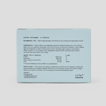 Zenith is a senolytic supplement built around four active compounds — fisetin, quercetin, piper longum and zinc. It's not a daily supplement. It follows the intermittent dosing logic used in senolytic research: six capsules a day, two consecutive days, once a month. Twelve capsules — one complete monthly cycle.